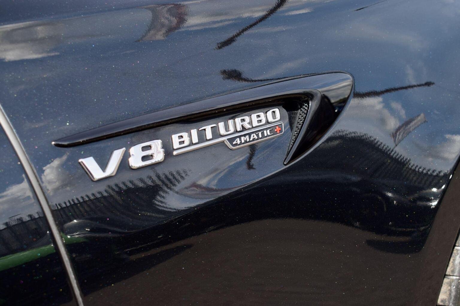 - Arrow-Shaped Wing Signet in High-Gloss Black above V8 BiTurbo 4MATIC Plus Badging